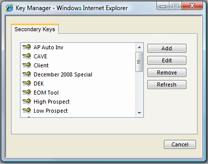 - Select the Keys Menu Item and click Manage Secondary Keys.