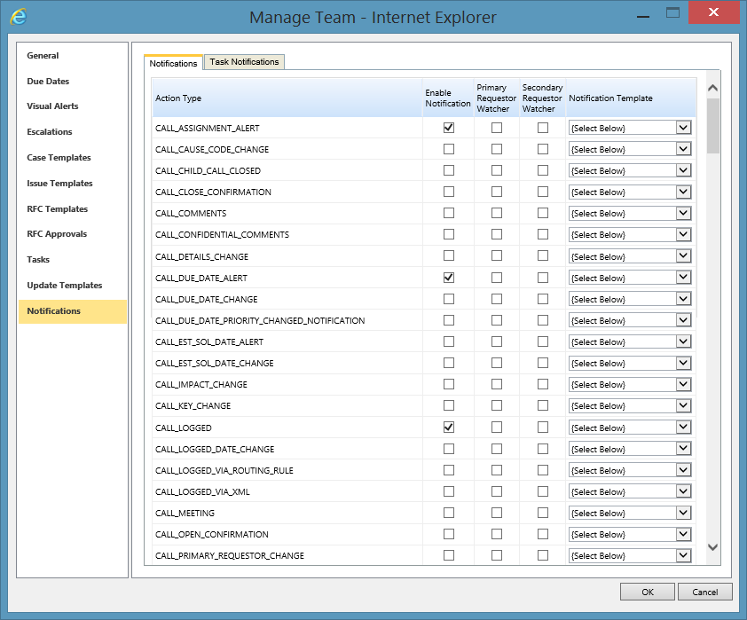 This Tab allows the configuration of the triggers for Watcher notifications. You can also specify which notifications the Primary and Secondary Reqeustor should receive. A template can be specified for each individual type of Notificaiton.